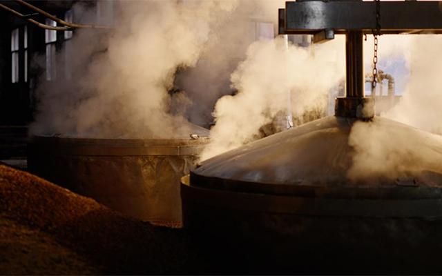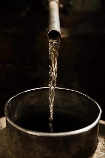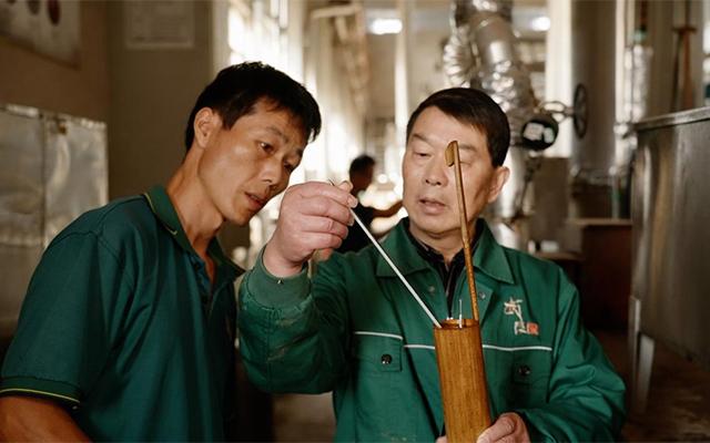 出酒时刻,氤氲的热气带着浓郁的香气渐渐在厂房内弥漫开来。微黄的酒水从被称为“牛尾”的出酒管中汩汩流出,流入瓢中,激起酒花。黄金轮次酒综合酒度要求调至55-57%vol,“看花识度”是每位武陵酒上甑工必须掌握的技能,他们通过看酒花就能判断出酒的度数高低。负责上甑的工匠用酒吊提上大半吊酒细心查看,他们根据酒花的大小、形态及密集程度初步判断酒体质量。