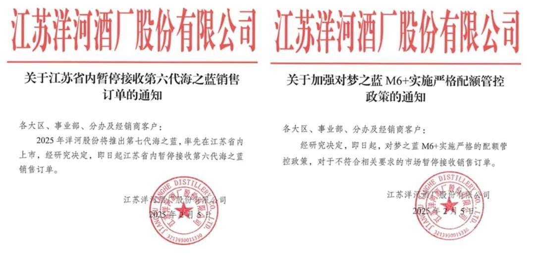 在这供需天平剧烈震颤的二月惊蛰,洋河股份接连祭出两道惊雷:先是暂停接收第六代海之蓝订单的破天荒公告,继而颁布梦之蓝M6+配额管控的雷霆通知。