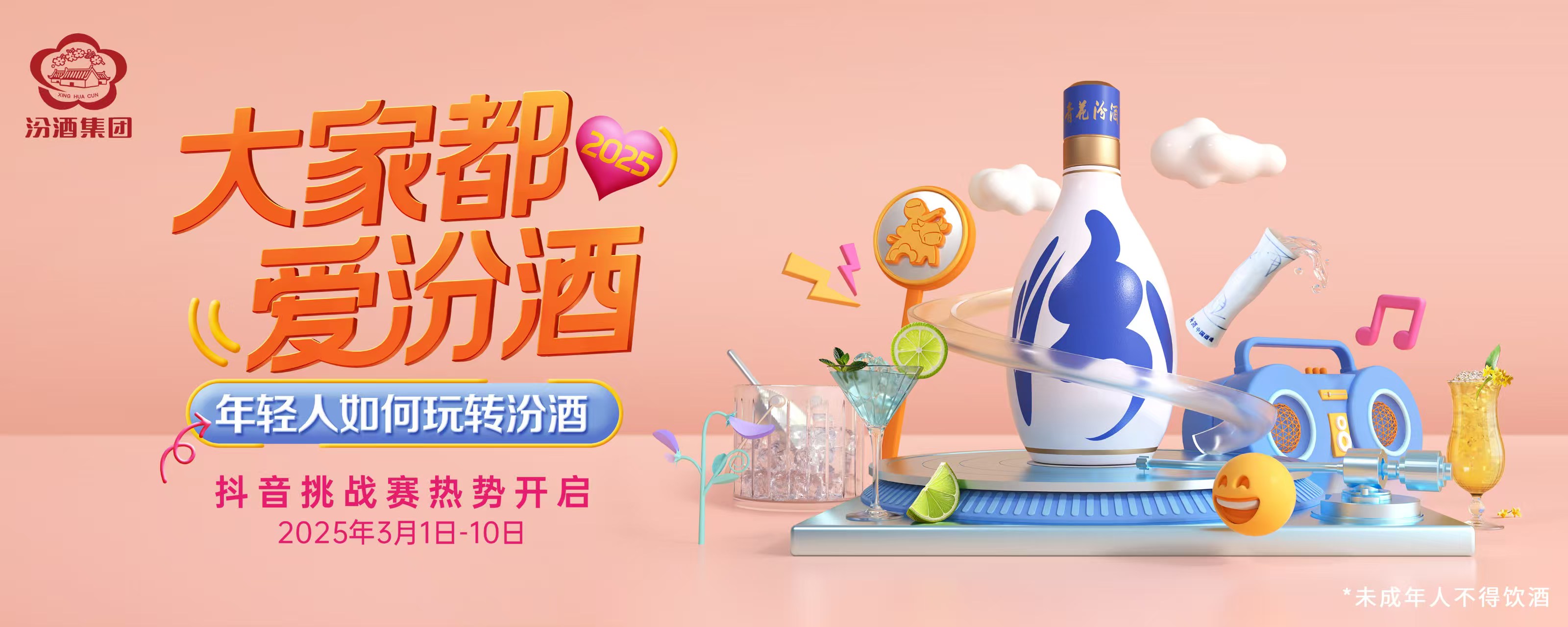 载歌载酒,“汾”外年轻。秋去春来,如今,在春花渐醒、春意渐浓的阳春三月,全网潮流青年想饮酒的DNA再次蠢蠢欲动。2025年3月1日-10日,#大家都爱汾酒 抖音挑战赛3.0版本高燃回归,即将开启。