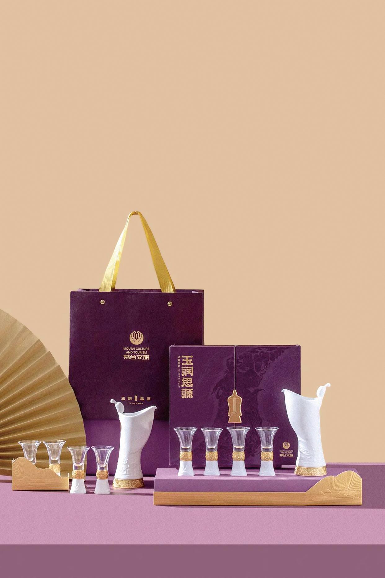 在此之前,茅台文旅还与顺美陶瓷合作推出了“玉润思源”酒具套装。酒具主体选用羊脂玉陶瓷材质,釉色洁白如玉,温润细腻,象征高尚品德;分酒器的设计灵感来源于举杯对酌,其手部造型巧妙地转化为鹰嘴倒流槽,便于取酒,八只酒杯则由陶瓷杯底、浮雕金属结构件与玻璃杯身三部分组成。倒转酒杯,可以清晰地看到杯底红色的印章,分别为“仁义礼智信敬忠孝”八个字。