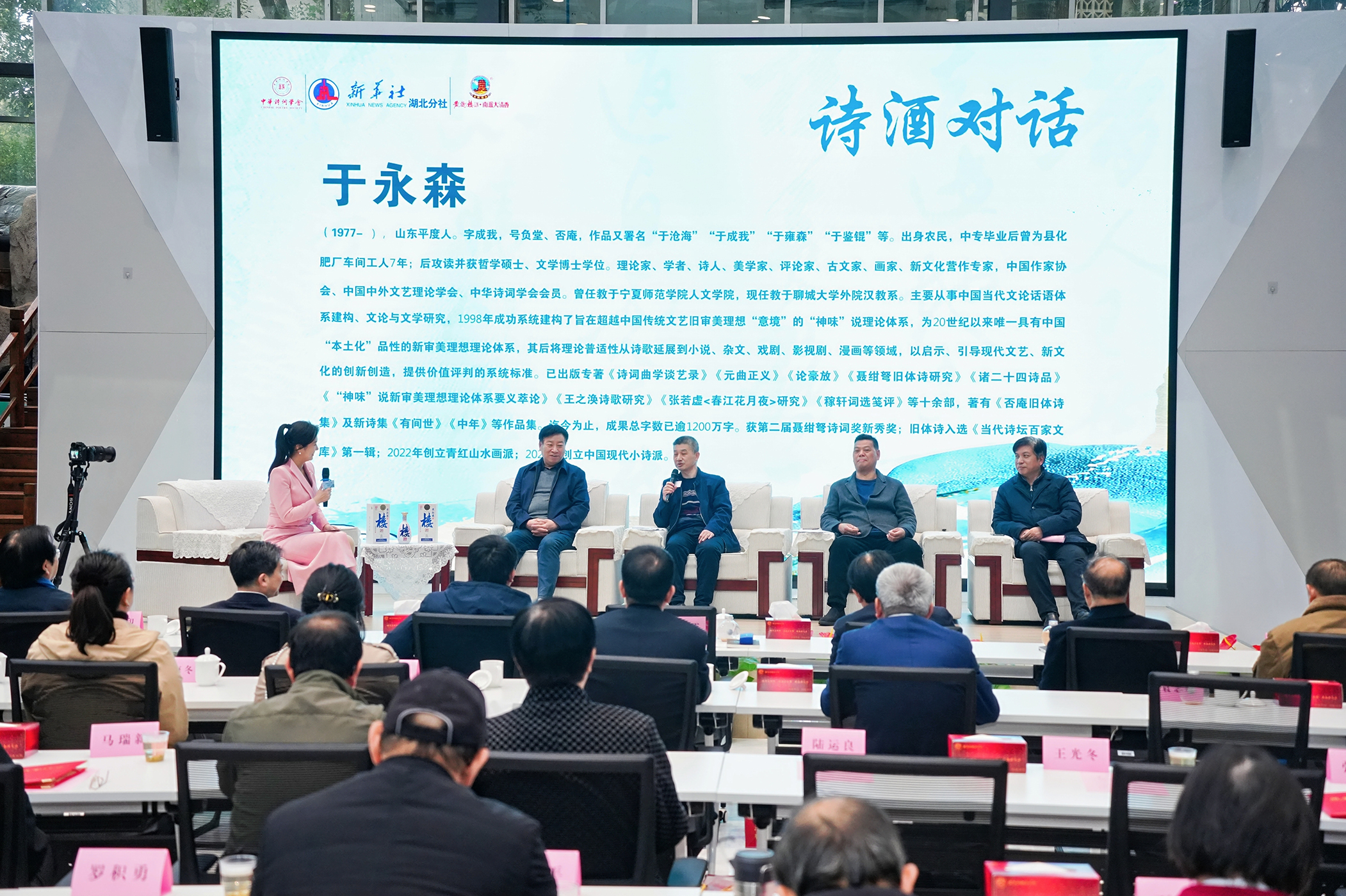 在“诗酒文化对话”环节,中华诗词学会副会长、《中华诗词》杂志社社长刘庆霖,聂绀弩杯年度诗坛人物、文学博士、副教授于永森,浙江省辞赋学会常务副会长、杭州古都书院院长袁志鹏,《中国优秀年度诗歌》系列丛书总策划李成等嘉宾围绕诗与酒的文化内涵展开深入探讨。