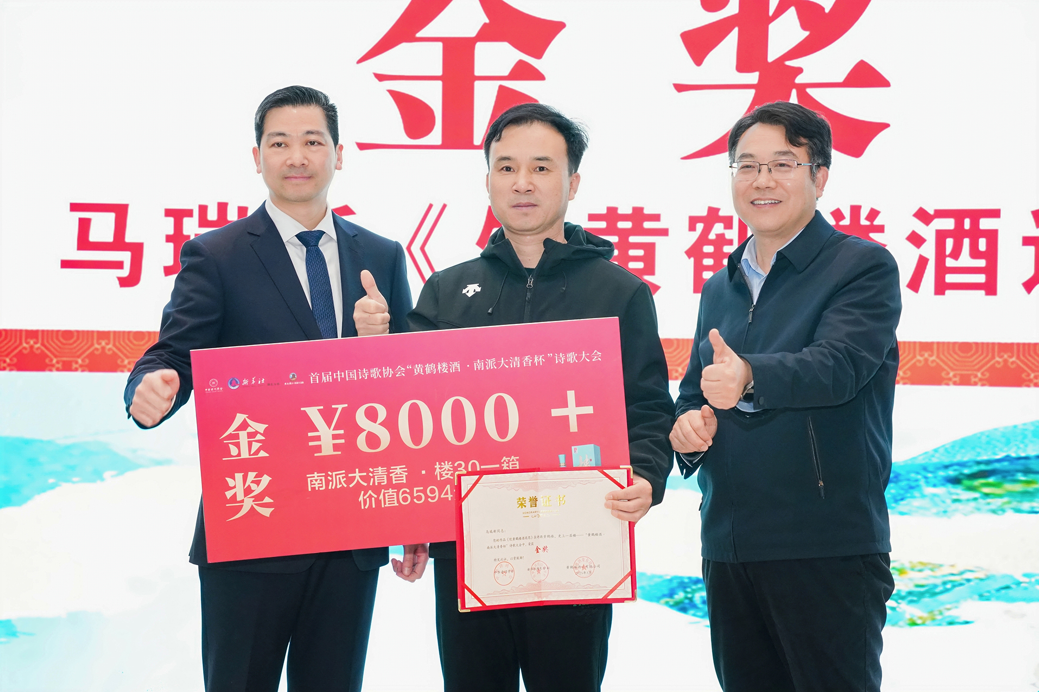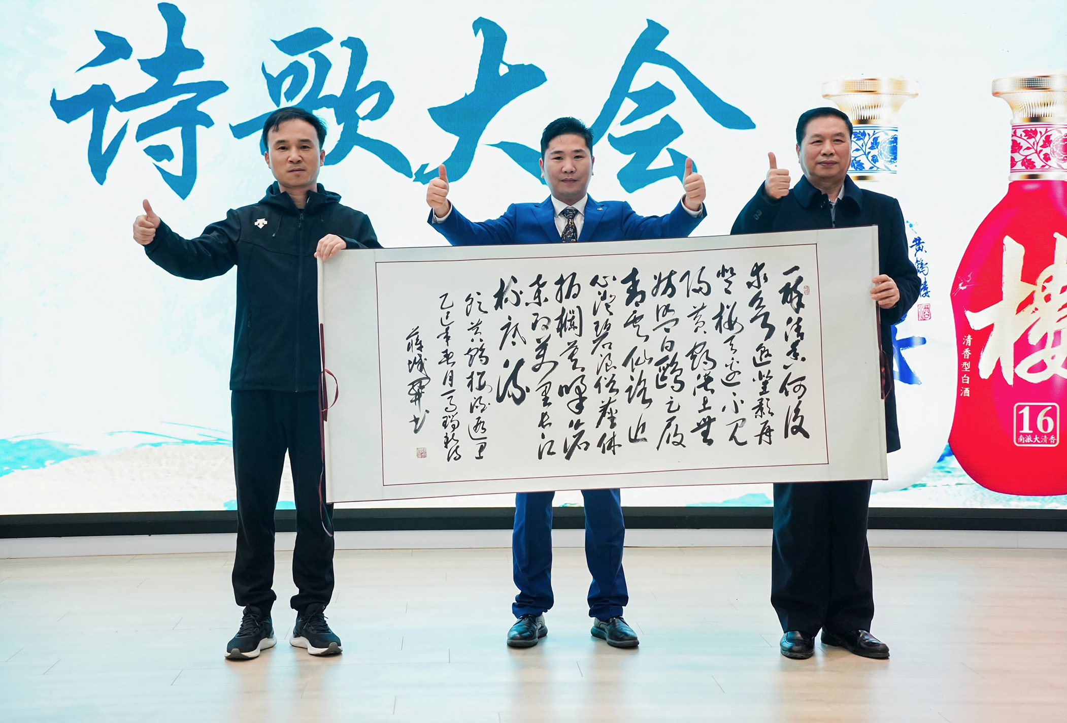 金奖得主马瑞新先生在现场解读了他的获奖作品。活动现场邀请了湖北省中华诗词学会樱花诗书画社社长蒋城关挥毫成书法作品,并将该作品赠予黄鹤楼酒业收藏展示。
