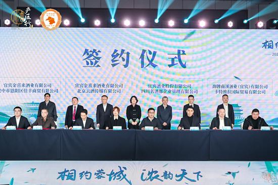 活动现场,南溪区人民政府与中国酒类流通协会正式签署战略合作协议,携手开启政企协同新篇章。企业签约环节中,宜宾金喜来酒业有限公司与北京云酒传媒有限公司、巴中市恩阳区佳丰商贸有限公司进行友好合作;劲牌南溪酒业有限公司与卡特维拉国际贸易有限公司;宜宾酒股份有限公司与四川名酒都企业管理有限公司进行战略合作签约。这些合作广泛覆盖品牌推广、渠道拓展以及国际贸易等多个重要领域,为整个宜宾白酒产区的发展注入了源源不断的新动能,助力产区在更广阔的市场中开疆拓土。