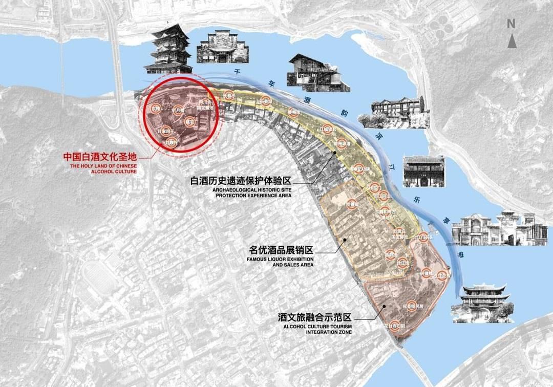 “一带”是指北望真武山,南接冠英古街,“中国酒市”形成了一条2.2公里长的千年酒韵滨江乐享带;“一地”则是宜宾市翠屏区近年来打造的宜宾五粮液501古窖池中国白酒文化圣地,预计今年投用;“三区”包括白酒历史遗迹保护体验区、酒文旅融合示范区、名优酒品展示交易区;由此延伸出中国酒市致力于打造的“三中心”,即世界名酒文化展示中心、中国酒类发布交易中心和国际酒品消费时尚引领中心。