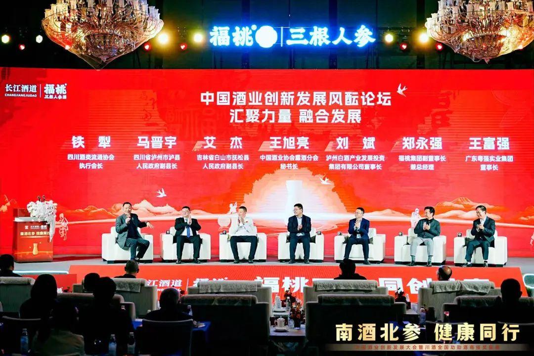 在风酝论坛环节,泸县副县长马晋宇、抚松县副县长艾杰、泸州白酒产业发展投资集团有限公司董事长刘斌、中国酒协露酒分会秘书长王旭亮、福桃集团副董事长兼总经理郑永强、粤强集团董事长王富强等六位嘉宾从产业优势、政策优势、消费趋势等维度出发共同探讨了白酒产业未来的发展趋势以及人参酒产业未来的发展机遇。