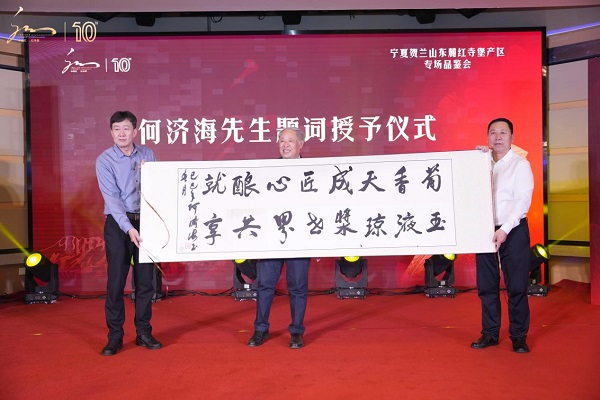 活动现场,宁夏贺兰山东麓葡萄酒产业园区管委会副主任康波、中国商业企业管理协会会长刘育才、吴忠市红寺堡区人大常委会主任苏达志等领导出席并致辞。原商务部副部长何济海通过视频连线题词“葡香天成,匠心酿就,玉液琼浆,世界共享”,为红寺堡产区十周年送上远程祝福。