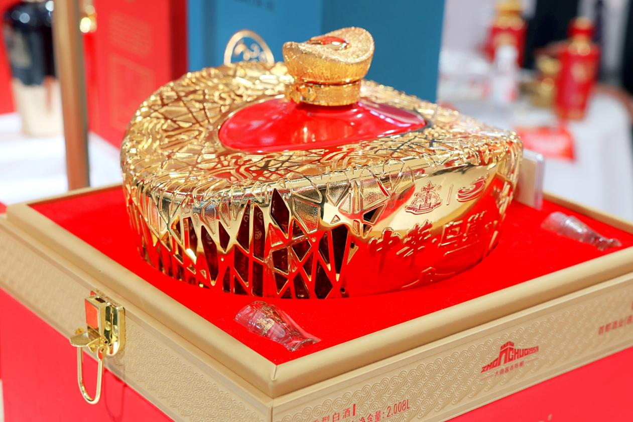 刘立清介绍,此次参展春糖,带来中华酒、中华酒(品味),中华酒(2025乙巳蛇年纪念酒)等文创产品,首款大坛酒中华酒(何尊坛)以及中华·鸟巢酒等世界级IP联名产品。中华酒瓶形方正,具有国潮范,采用中国红的红釉设计,瓶身有代表五千年文化的波浪纹饰,以及中国建筑艺术的斗拱元素。金台造型寓意“步步高升”,是一款高品位白酒产品。