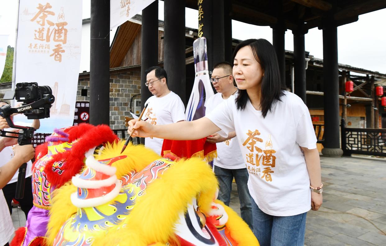 武夷山的茶叶最早从陆路走出国门。地处武夷山梅溪下游的下梅村,是万里茶道的起点。茶香酒韵,舞狮鸣锣,当日上午10时许,“茶道酒香汾酒品牌推广活动”在下梅村盛大启幕。 “一点左眼,观茶道千年,启文化传承;二点右眼,望酒香万里,开品牌新篇;三点额头,聚晋韵匠心,佑汾酒远航” ,点睛环节,主办方领导手持朱砂笔,为雄狮“点睛”。在一片喝彩声中,完成点睛的雄狮猛然跃起,随着铿锵的锣鼓声,舞狮表演队惊艳亮相,腾挪跳跃,时而威风凛凛,时而憨态可掬,点燃全场热情。