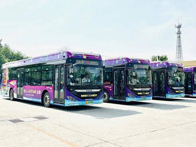 清晨的烟台南车门场公交站洋溢着节日氛围,4辆身披“紫釉华服”的主题巴士整齐列阵,车身以鎏金葡萄藤蔓勾勒烟台山灯塔、黄海浪花等城市标识,宛如流动的葡萄酒文化名片。