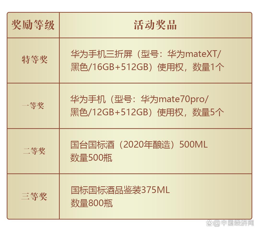 从华为Mate XT三折屏手机,到品质美酒国台国标(2020年酿造);从大额消费券,到国台品鉴小酒的体验装……上万份奖品整装待发,不管你是刚进门的观众,还是坐在最后一排的“隐形幸运儿”,来了就有机会拥有!