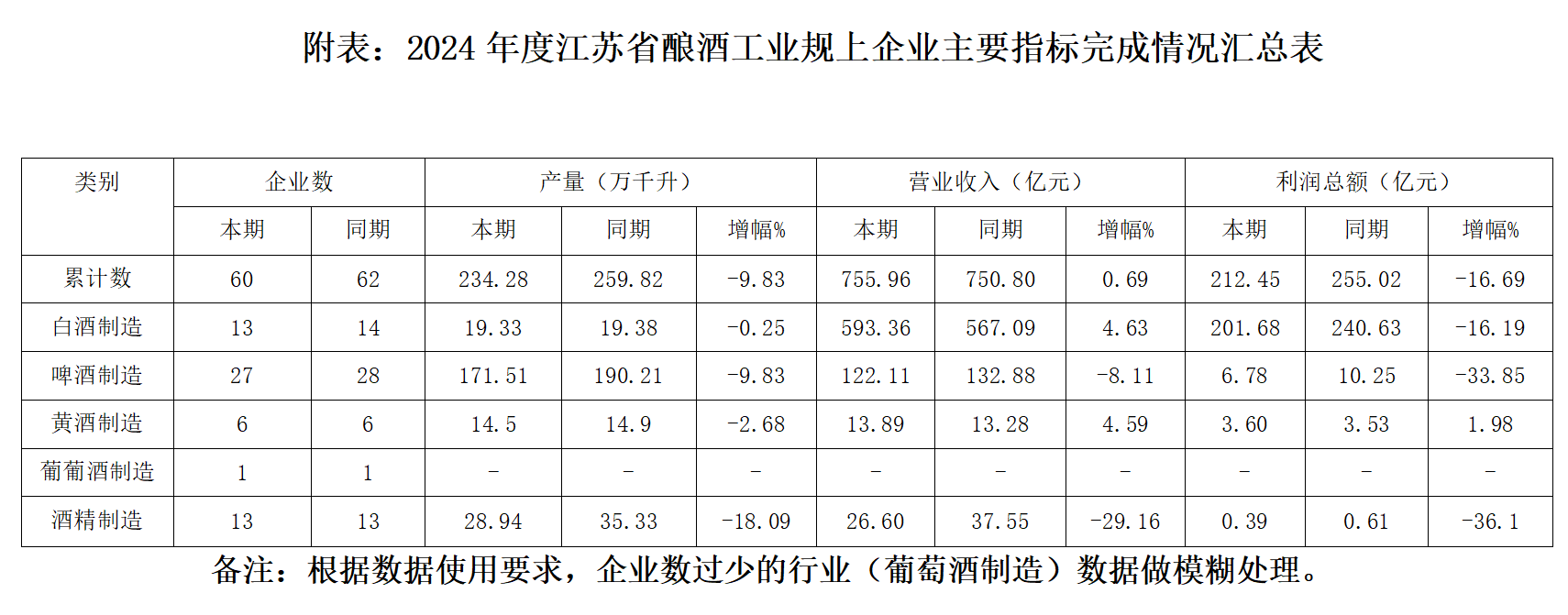 2024年,江苏省酒业整体呈现“收入微增、利润承压”态势,酿酒工业规上企业累计完成产量234.28万千升,同比下降9.83%;累计完成销售收入755.96亿元,同比增长0.69%;累计完成利润总额212.45亿元,同比下降16.69%,反映出行业盈利能力遭受严重挤压。