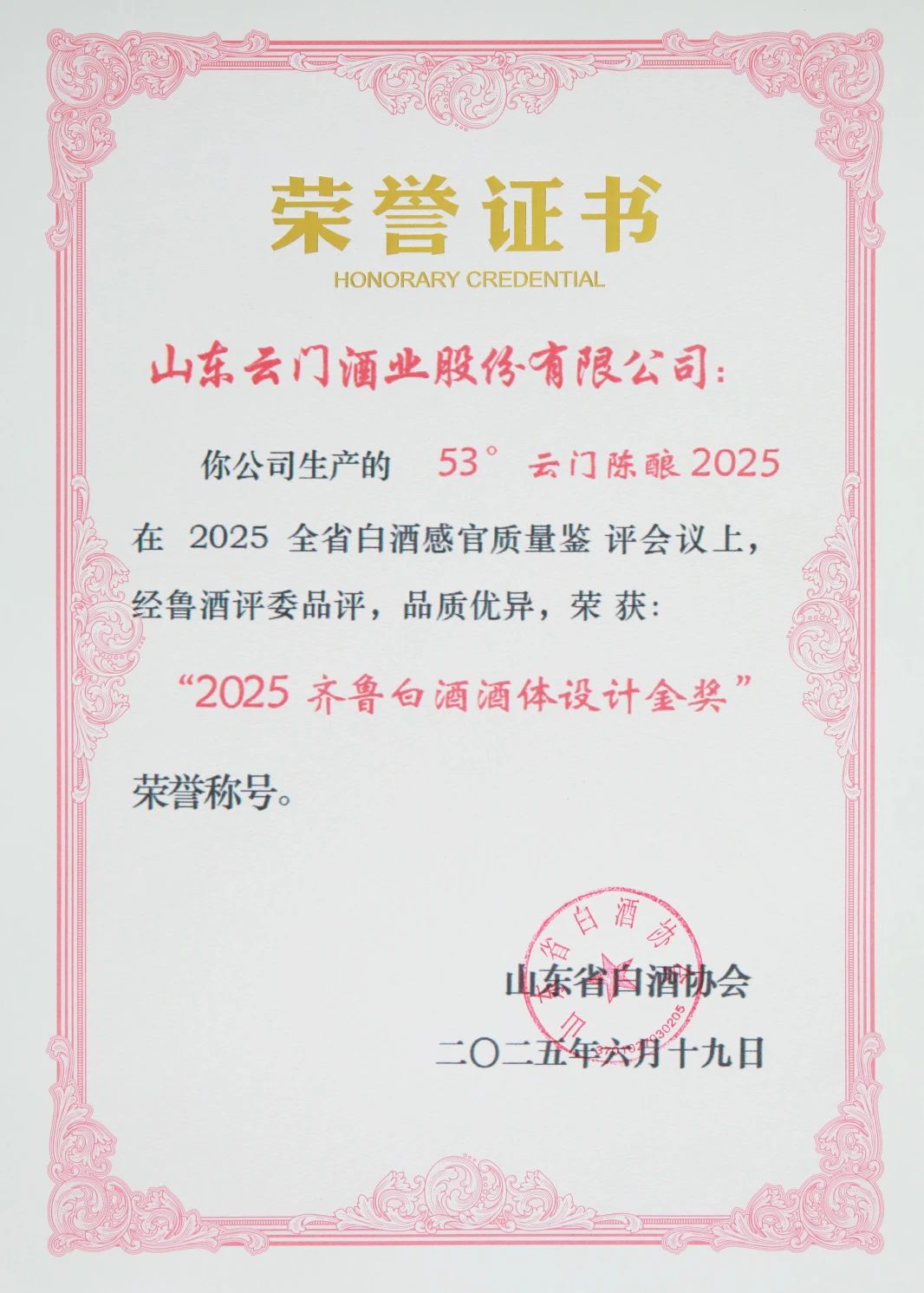 53°云门陈酿·玉白2025版荣获2025齐鲁白酒酒体设计金奖!