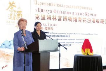 在中俄两国嘉宾的共同见证下,克里姆林宫博物馆代表维亚切斯拉夫先生、叶卡捷琳娜女士与汾酒集团代表韩英,现场展示克里姆林宫收藏的青花汾酒。 张欣林摄