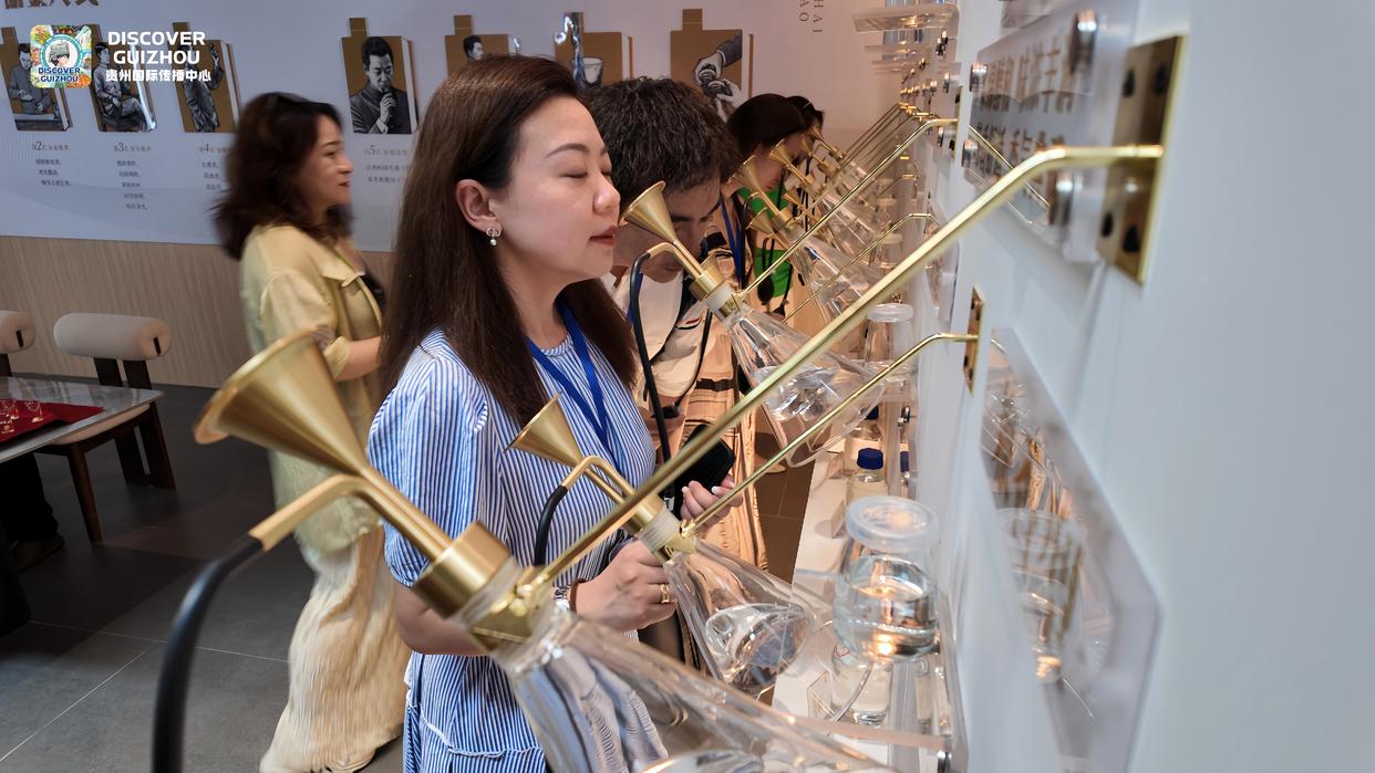 来自海外华文媒体的代表在基酒品鉴区,就白酒的勾调工艺与讲解员展开互动。当被问及“成品酒如何调制”时,讲解员详细解释说:“我们的成品酒由7个轮次的基酒勾调而成。一二轮次口感偏酸,三四五轮次呈现醇香,六七轮次则具有独特的焦糊香。通过调酒师的精准配比,最终形成‘酱香突出、层次丰富’的典型风格。”