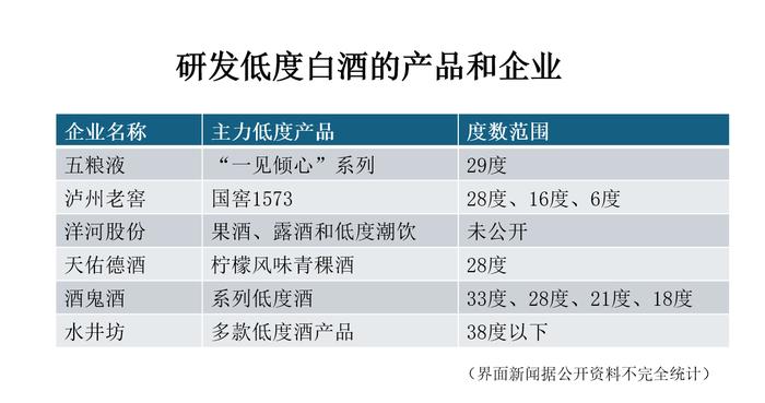 现阶段,头部酒企加速推进低度化,五粮液计划推出29度“一见倾心”(曾于1990年代初推出同度数产品后停产),泸州老窖28度国窖1573已研发成功并拟开发16度、6度产品,洋河股份、水井坊、酒鬼酒、天佑德酒等也已研发或推出低度酒,市场上甚至出现柠檬口味白酒。