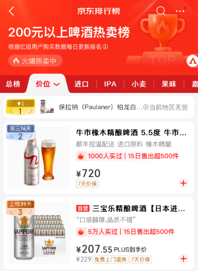 京东、天猫等电商平台数据显示,牛市啤酒上线后,迅速冲入啤酒类销售榜单前列,成为当前最受欢迎的啤酒品牌之一。据京东商智统计,8月1日至8月13日期间,牛市啤酒成交金额高居京东啤酒品牌首位;8月27日,该品牌位列京东“200元以上啤酒热卖榜”第二,并已连续15天稳居前三。另据天猫生意参谋统计,上市当天,牛市啤酒斩获天猫平台啤酒品牌销售额第一。