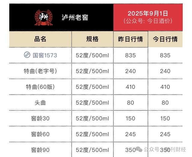 最新批价监测显示,截至9月1日,国窖1573批价约为835元/瓶,特曲老字号为240元,特曲60版为410元。与2025年初相比,整体呈现小幅下行趋势,其中国窖1573下降25元,特曲老字号微降5元,特曲60版批价维持410元不变。