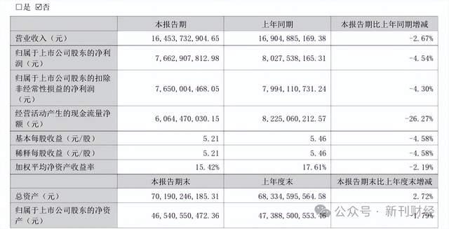 8月29日晚间,泸州老窖披露2025年半年度业绩报告。数据显示,公司在报告期内实现营业收入164.54亿元,同比减少2.67%;实现净利润76.63亿元,同比下降4.54%。