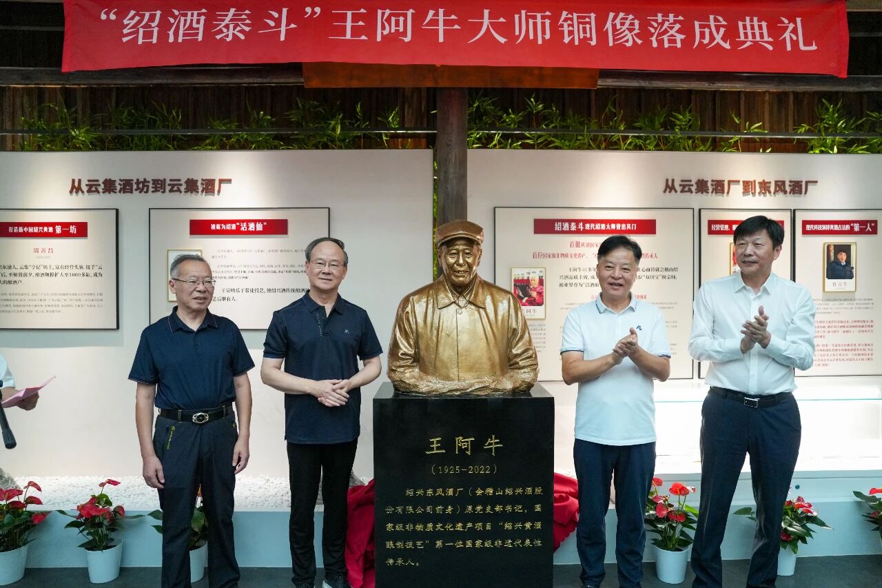 仪式由会稽山党委书记、副董事长傅祖康主持。绍兴市原副市长、绍兴市黄酒行业协会会长徐明光,绍兴市非物质文化遗产保护协会会长何俊杰,精工控股集团董事长、会稽山董事长方朝阳,与大师后人代表王新潮共同为铜像揭幕。揭幕礼成,这座铜像不仅是对大师百年人生的崇高致敬,更是绍兴黄酒人心中一座不灭的“匠心灯塔”。