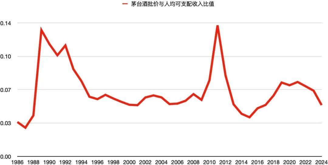 其实2022年以来的调整期并非茅台历史上首次调整期,茅台酒市场价格与人均可支配收入的比值自1986年以来曾出现两次大起大落。