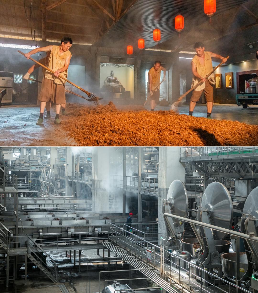 古井贡酒·年份原浆传统酿造区(上)与古井智能园酿酒车间(下)