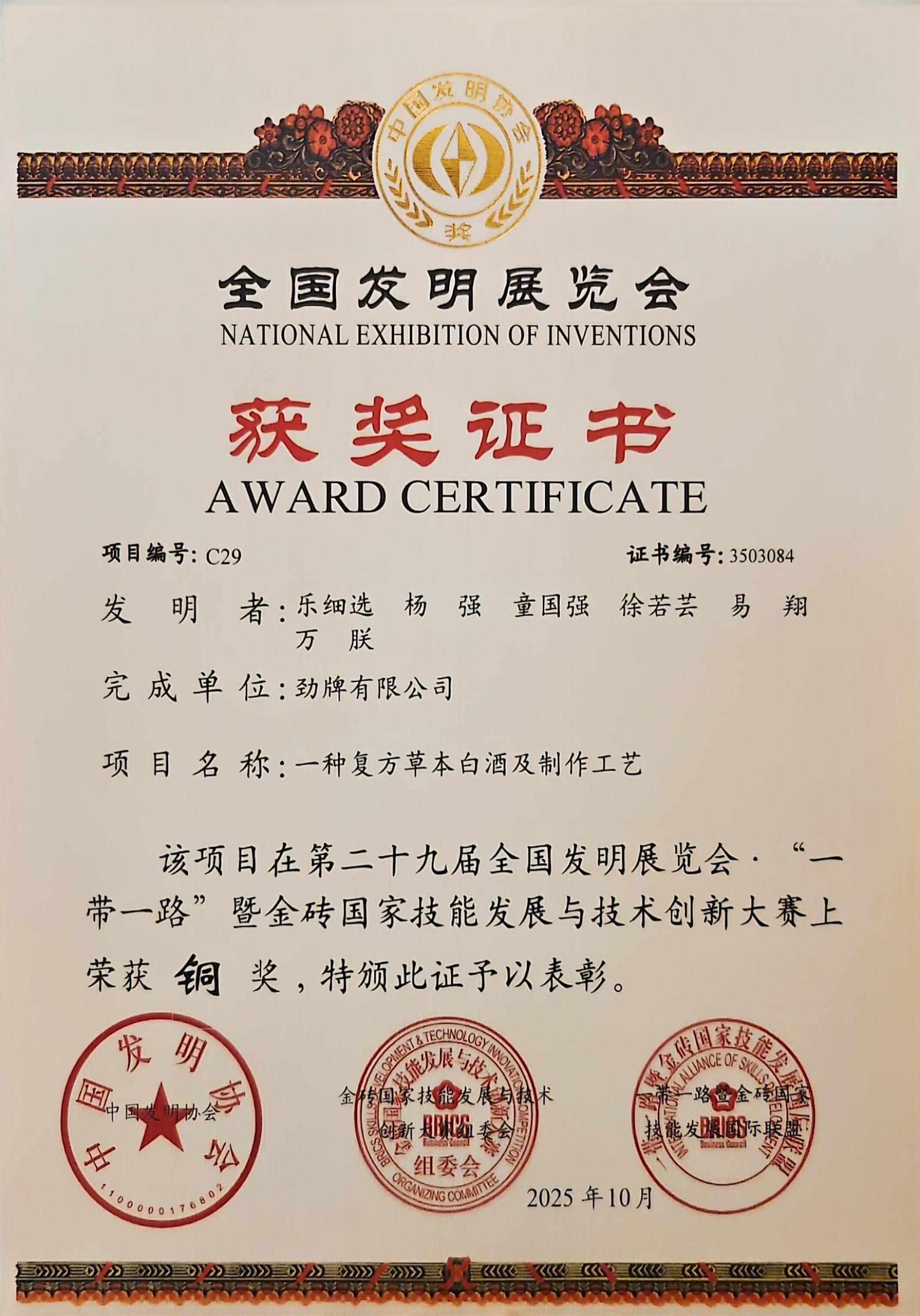劲牌在第二十九届全国发明展览会 “一带一路”暨金砖国家技能发展与技术创新大赛中荣获“一金一铜”