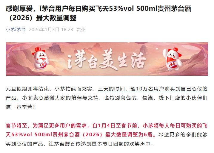 1月3日晚间,贵州茅台“小茅i茅台”发布最新消息称,春节将至,为满足更多用户的需求,自1月4日至春节前,小茅将每人每日可购买的飞天53%vol 500ml贵州茅台酒(2026)最大数量调整为6瓶。