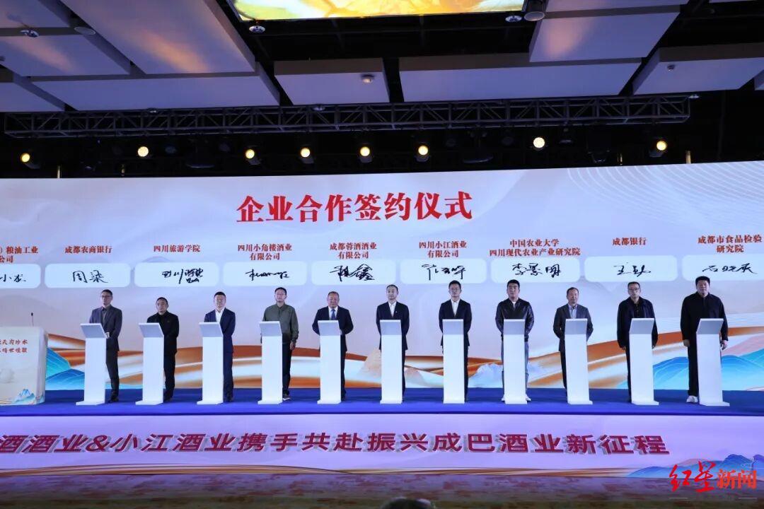 签约环节上,蓉酒酒业公司、小江酒业公司联合合作伙伴四川小角楼酒业公司,共同与中国农业大学四川现代农业产业研究院、四川旅游学院、成都银行、成都农商行、成都市食品检验研究院、中粮(成都)粮油工业有限公司、成都友一包装材料有限公司、成都市川泰玻璃有限责任公司等签订合作协议,覆盖科研技术、金融服务、检验检测、供应链等多个领域。