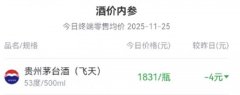 近期白酒市场整体运行平稳,作为高端白酒领域的 风向标,53度/500ml飞天茅台全国终端价格保持稳健运行,显示其价值韧性。新浪财经《酒价内参》11月25日数据显示,其终端零售均价为1831元...