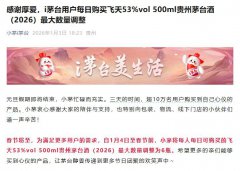 1月3日晚间,贵州茅台小茅i茅台发布最新消息称,春节将至,为满足更多用户的需求, 自1月4日至春节前,小茅将每人每日可购买的飞天53%vol 500ml贵州茅台酒(2026)最大数量调整为6瓶。 此前...