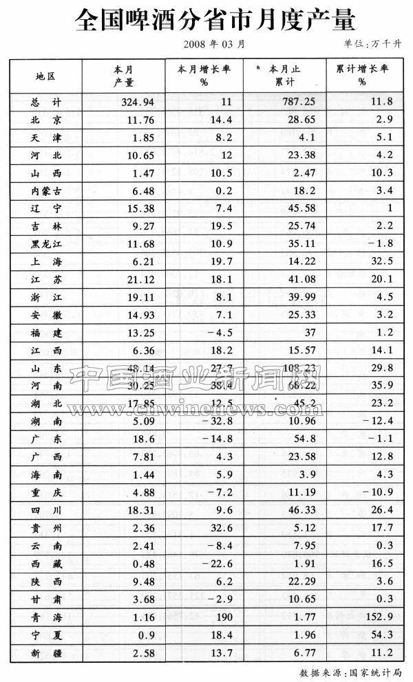 首页酒业资讯啤酒 啤酒 全国啤酒分省市月度产量 2008-05-12 16:27 啤酒 上一篇重庆渝北区质监局取缔一个啤酒制假窝点知名啤酒只有酒瓶是真的 好在你们第一时间就端掉了制假窝点。近日,在获悉自己的品牌被不法分子假冒后,百威、嘉士伯、喜力等高档啤酒的驻渝负责人在感到气愤和震惊之时,更对重庆市渝北区质监局打假保优的做法给予了高度评价,并表示以后一定与质监部门紧密配合,把维 上一篇百威:哈啤整合决定是否本土化成功自从2004年收购了具有百年历史的哈尔滨啤酒之后,关于如何整合这个中国品牌,百威鲜少在媒体面前透露。在安海斯布希公司(AB)正式进入中国15年时,该公司大中国区总裁程业仁首次正面承认对哈啤的整合已取得了阶段性成功,而从2008年开始的AB公司对哈啤的进一步整合是 相关文章 燕京啤酒推出首款“玻尿酸”啤酒 正月十五闹元宵,杰克熊猫与您共度佳节! 燕京啤酒冬奥喝彩活动火爆开启 免费“冰墩墩”等你来拿 硬核凭实力 | 乌苏啤酒正式宣布吴京为品牌代言人 嘉士伯以艺术开启更顺2022,“虎虎生辉”艺术馆空降花城广州 大跃啤酒焕新出发,为消费者提供更多创意好精酿 楽如斯×中国邮政文创 生肖联名 “与虎谋啤”精酿啤酒上市发布 燕京V10精酿白啤双11:获天猫白啤品类销售额第一 家乡啤酒-德伦堡上线天猫,快来尝尝东北味 “小酒瓶”雪糕走红网络,看燕京U8如何玩转品牌联名