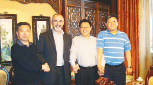 5月22日,VINITECH展览公司总组织干事格里耶·樊尚来到蓬莱,就会议期间的具体事宜与华夏酒报、蓬莱市葡萄与葡萄酒局进行商谈,并就长期合作事宜达成共识。图为蓬莱市副市长慕庆和(左一)、VINITECH展览公司总组织干事格里耶·樊尚(左二)、《华夏酒报》总编辑刘世松(右二)和蓬莱市葡萄与葡萄酒局局长季兴典(右一)会谈后亲切握手。