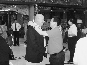 | 《华夏酒报》总编辑刘世松与外国友人相拥握手。