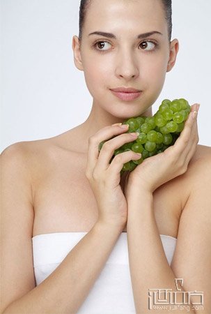 将葡萄洗净去皮、去核,放入果汁机中榨成汁,将汁液收集于玻璃杯中。每日早、晚洗脸后,用此汁液涂搽面部,涂搽20—30分钟后用清水洗净。此面液可爽肤,治疗痤疮,淡化雀斑。