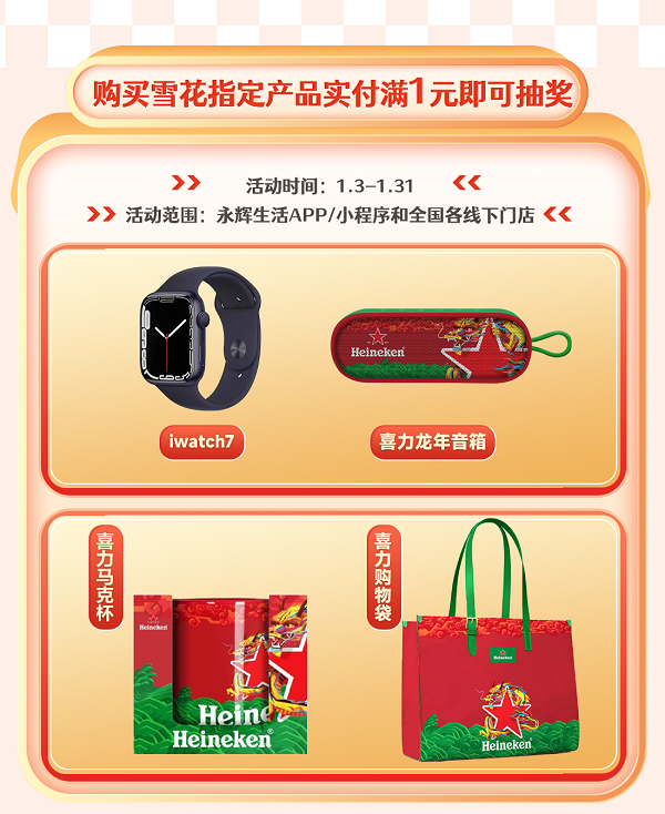 同时,在永辉生活APP/小程序及全国各线下门店购买嘉士伯指定产品实付满1元即可抽奖,奖品包含5000元旅游基金、500元购物卡、200元电话充值卡等,欢乐畅饮,相聚畅游世界;在永辉生活APP/小程序及全国各线下门店购买喜力指定产品实付满1元即可抽奖,奖品包含iwatch7、喜力龙年音箱、喜力马克杯等,龙年大吉,相聚迎新年;在永辉生活APP/小程序及全国各线下门店购买真露指定产品实付满1元即可抽奖,奖品包含iPhone 14 Pro 256G-颜色随机、iPad (第十代)256G、AirPods (第三代)等,购真露,相聚享好礼。