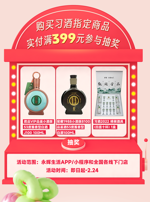 为助力消费者品好酒传深情,即日起至2月24日,在永辉生活APP/小程序及全国各线下门店购买汾酒指定商品实付满88元可参加抽奖,奖品包含53度汾酒青花30复兴版500ml、42度杏花村X18一瓶、汾酒艺术纪念盘等,典雅飘香,回味悠长;同时间段,在永辉生活APP/小程序及全国各线下门店购买习酒指定商品实付满399元可参加抽奖,奖品包含君品VIP品鉴小酒版 53度100ml酱香型白酒J100 100ml、窖藏1988小酒版8100品鉴酒100ml 53度酱香型白酒100ml、习酒2022 精装酒具(四壶十杯) 1盒等,经典酿就品质佳酿。