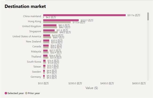 截至2024年9月,南澳州葡萄酒出口到中国大陆市场的年出口总量达3710万升,占南澳州年总出口量的38%;出口到中国市场的年出口总额达到约5.17亿澳元(24.5亿人民币),占南澳州葡萄酒年出口总额的43%。