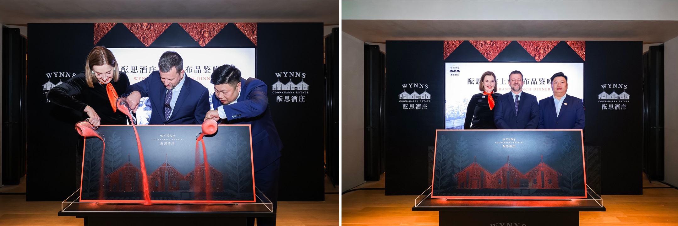 品牌发布晚宴之上,嘉宾们将那象征库纳瓦拉产区珍贵的红色石灰土(Terra Rossa)倒入品牌标志性三尖顶的装置之中,随着沙土的缓缓堆积,红土中逐渐显现“WYNNS”字样,预示着酝思酒庄开启对中国市场的悉心耕耘。
