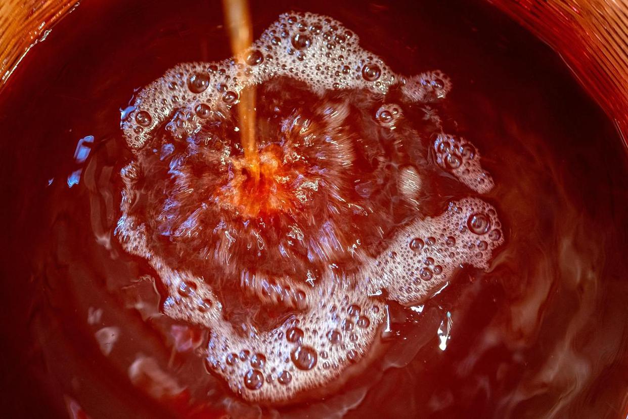 发酵完成的红曲酒晶莹剔透,艳丽无比。