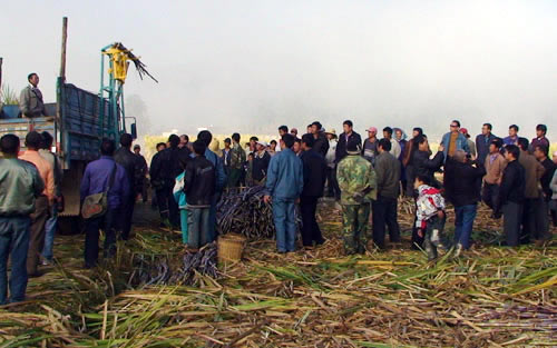 当地蔗农现场观摩甘蔗装载机的示范应用