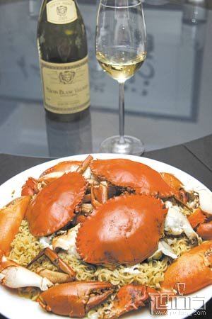 首先出场的是“潮式大红蟹蒸面”,与之搭配的是“马孔白葡萄酒”。杯中荡漾着浅黄的色泽,花香馥郁并伴随着淡淡的柠檬的清香,入口较干而果味十足,结合着重原汁原味的清蒸海鲜菜式,相互配合出更为清爽怡神的口感。