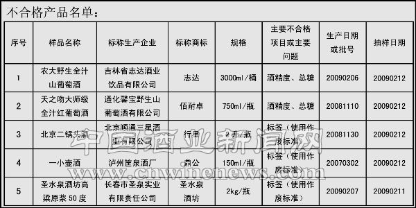 长春市工商局根据国家工商总局《流通领域商品质量监测办法》的规定,于2009年第一季度委托版权中国酒业新闻网吉林省食品工业产品质量监督检测站对流通领域10个品种79个批次的食品进行了质量监测,检测发现不合格食品23个批次,合格率为70.89%。其中5家酒类企业的部分产品名列黑榜(见表)。