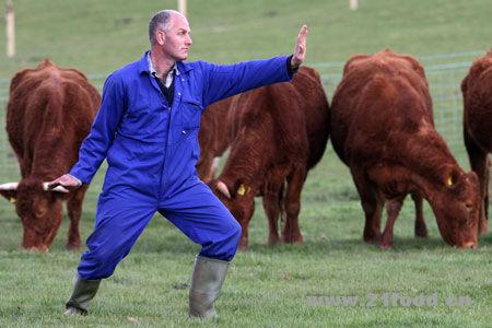 英国《泰晤士报》4月14日文章,原题:太极调节奶牛情绪助产 毫无疑问,中国的太极可以带来无穷的好处,但增加牛奶产量是没被人们想到的,但是在过去六个月,Rob Taverner一个奶牛场的农夫,每天早上都会身穿那套蓝色工作服和一双防水长靴,在他喂养的奶牛们面前打太极