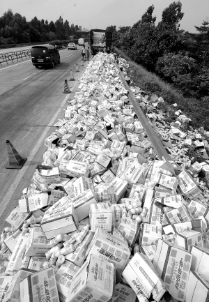 昨日上午9时多,佛开高速距张槎出口约500米处,一辆大货车因为货箱护栏固定不牢固,车上数吨牛奶饮品倾倒在路面上,堆成了一座小山。司机不得不将车停在路边,并叫来几名工人帮忙收拾满地的牛奶。