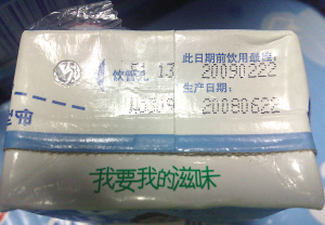 随后,记者来到北京华联民族宫店。在牛奶促销区,不少市民正在争购牛奶。记者发现,伊利优酸乳由原来的零售价1.8元/盒降到1元/盒,蒙牛纯牛奶则由40元/箱降到22.4元/箱。这些牛奶都是2008年8月份前后生产的。牛奶包装盒上并未发现贴有“经检验符合三聚氰胺限量值规定”的绿色标识。