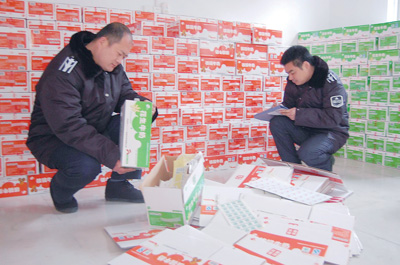 1月3日下午,河南省杞县质监局接到群众举报,在该县城东环路南段一民房内查获一生产假冒饮料窝点,现场查封核桃牛奶饮料205件,花生牛奶饮料310件,产品包装箱900个。经鉴定,所查获的饮料全部为假冒产品。图为执法人员在现场对查获的饮料进行封存。