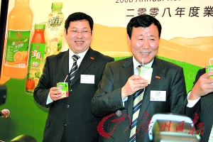 昨日业绩发布会上朱新礼(右)一直笑容可掬。