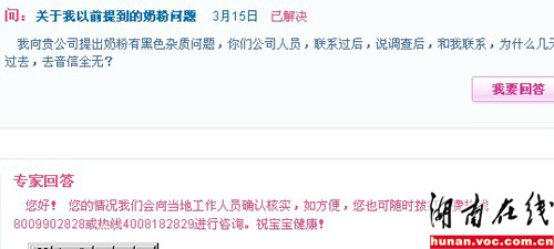 喻小姐先后与售后人员、客服和圣元官方网站专家取得联系,得到的回复均是会“认真调查,稍后答复”。“网站专家的回复还稍微详细点”,喻小姐称,网站的专家认为,杂质可能是消费者开装后自己掉进去的;还有一种可能,就是奶粉生产过程中,因为高温而产生的对人体无害的焦糊粉。