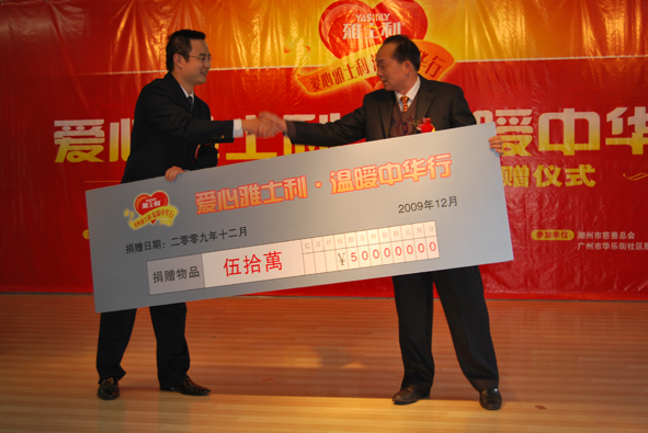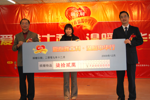 雅士利集团公益事业总负责人张培喜代表公司将72万元物资捐赠牌递交给广东省慈善总会项目部部长李春梅和广州市儿童福利院院长徐久
