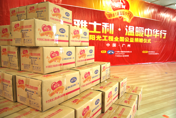 12月24日,圣诞老人正准备好各种礼物,为全世界的小朋友送去欢乐。在广州市社会(儿童)福利院,这里的孩子不用等到圣诞夜,由“爱心雅士利 温暖中华行”千万阳光工程全国公益捐赠活动,来到广州市社会(儿童)福利院,为他们带来急需的奶粉、文具、体育用品,让稚嫩的心灵能够沐浴在“千万阳光”之下健康成长。